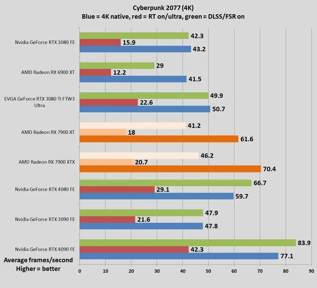 RTX 4090이 RTX 4080보다 레이 트레이싱에서 훨씬 앞서고 있다는 것은 의심의 여지가 없다. 이런 결과는 하드웨어적인 특성 때문에 나타날 수 있다. RTX 4090을 진정한 최상급으로 친다면 47fps와 비교해 볼 때 83 fps라는 것은 확실히 느낄 수 있는 큰 차이다.